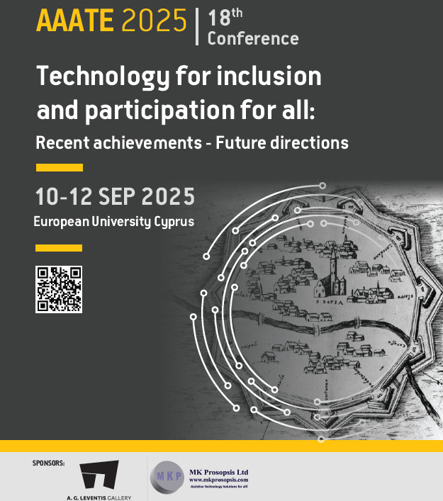 As a company active in the field of assistive technology in Cyprus and abroad, and dedicated to promoting equal access, MK Prosopsis Ltd is pleased to be a sponsor of the 18th International Conference of the Association for the Advancement of Assistive Technology in Europe (AAATE), which will be held for the first time in Cyprus, on 10–12 September 2025, at the European University Cyprus.