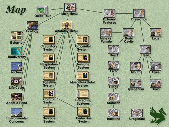 The Dissection module allows students to perform an entire frog dissection. They can make cuts with a "digital scalpel" and then see the actual cuts with full-screen videos. And unlike a real dissection, mistakes are easily corrected.